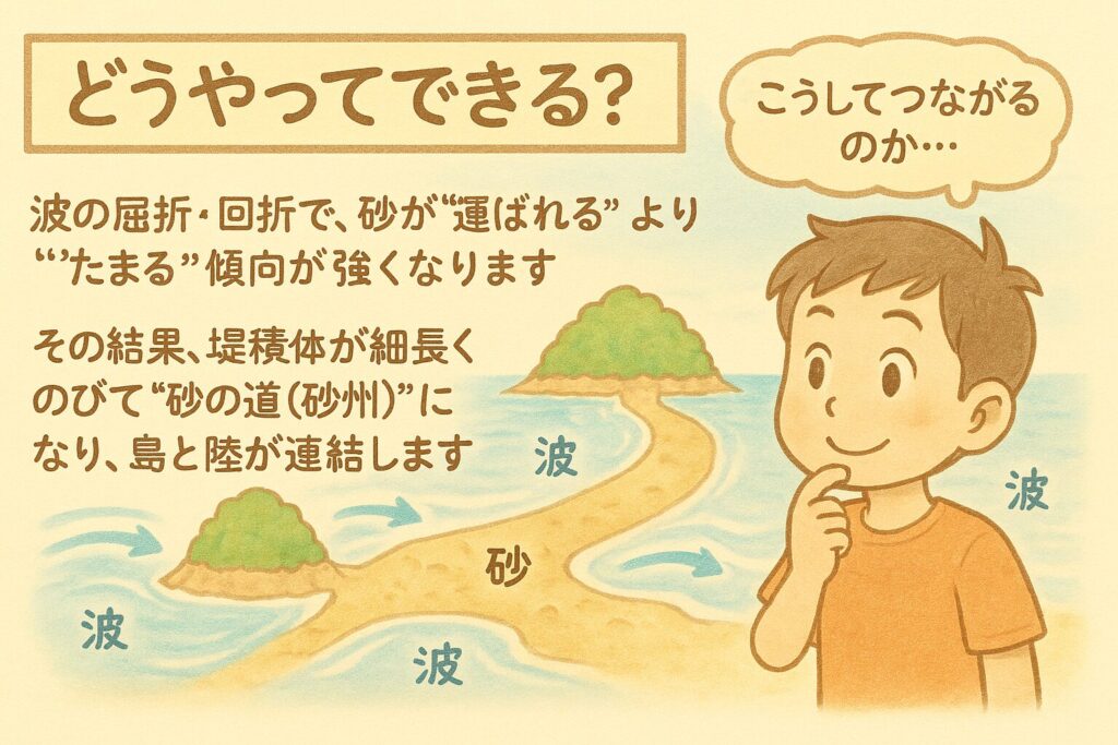 **「島が“波よけ”になって、背中側に砂がたまる。干潮で砂の道が顔を出し、満潮で水に隠れる」**というイメージです。