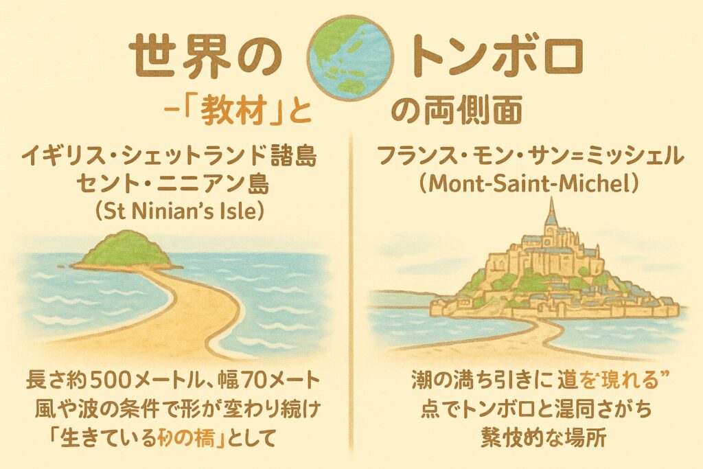 - 代表例:英国シェットランドの**セント・ニニアン島(St Ninian’s Isle)は、長さ約500mで「英国最大級の活動的(今も形が変わる)砂質トンボロ」**として教材・保全の両面で扱われています。