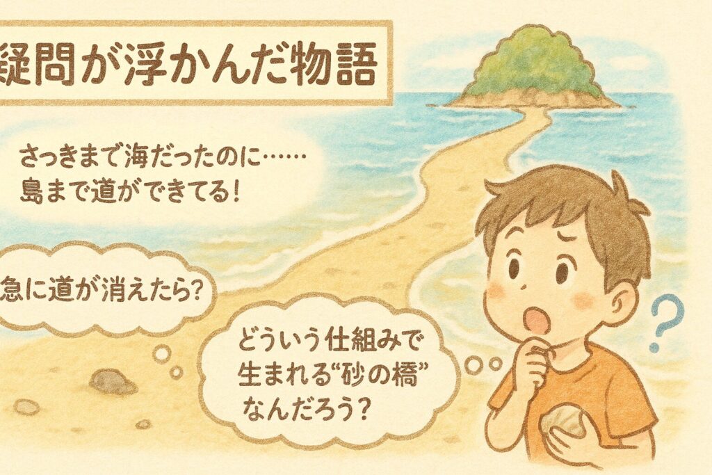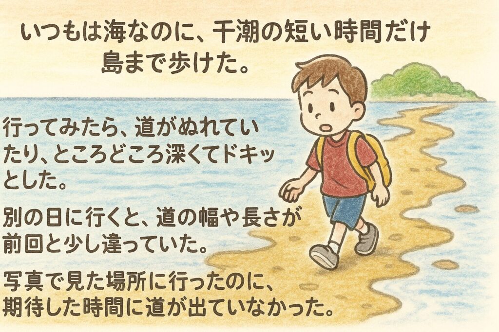 潮が引くと、さっきまで海だった場所に細い砂の道が現れて、小さな島まで歩いていけた——そんな体験、ありませんか?