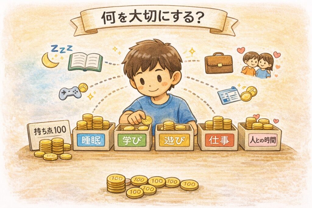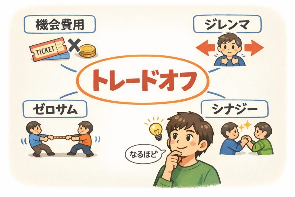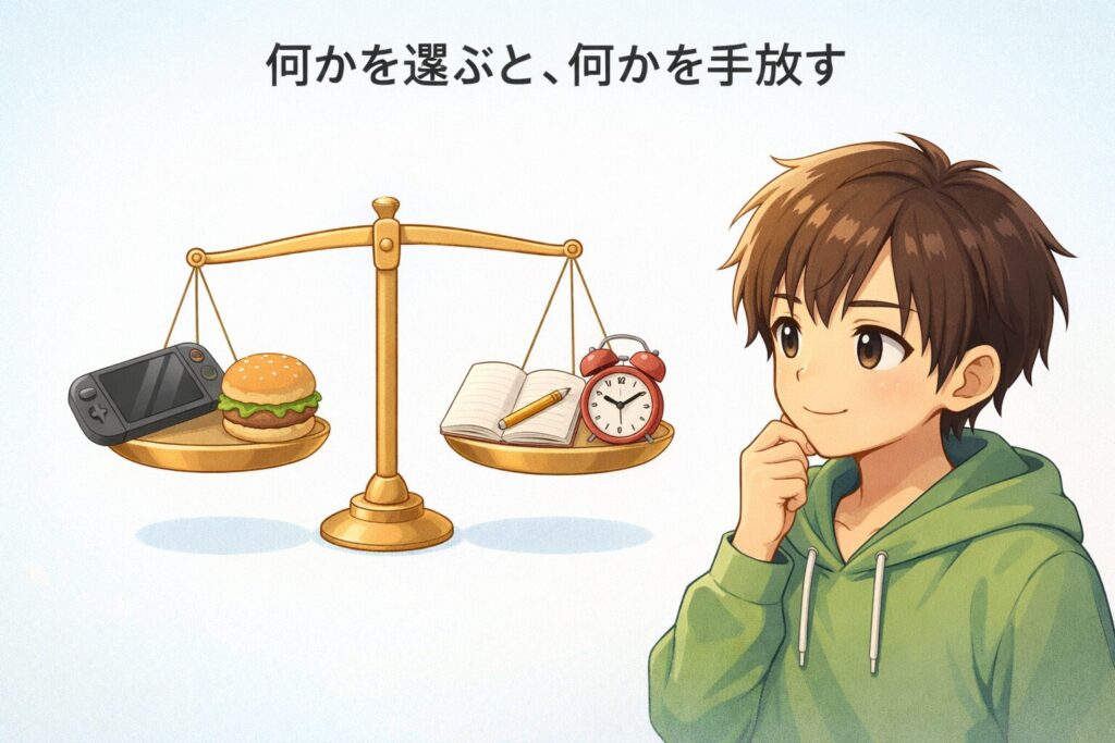 トレードオフ』とは、限られたお金・時間・体力などの中で、何かを選ぶと別の何かをあきらめる関係のことです。